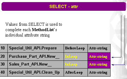 When executing a job, the Sql Statement that is configured by you will be used as a cursor to loop through each of the rows returned and perform the methods with action 'InLoop' in the Maintenance/Method List tab. A complete attribute string will be created with all the columns of the rows returned by the Sql statement. This attribute string is then used to complete each individual attribute string for the methods in the method list with values from selected data.